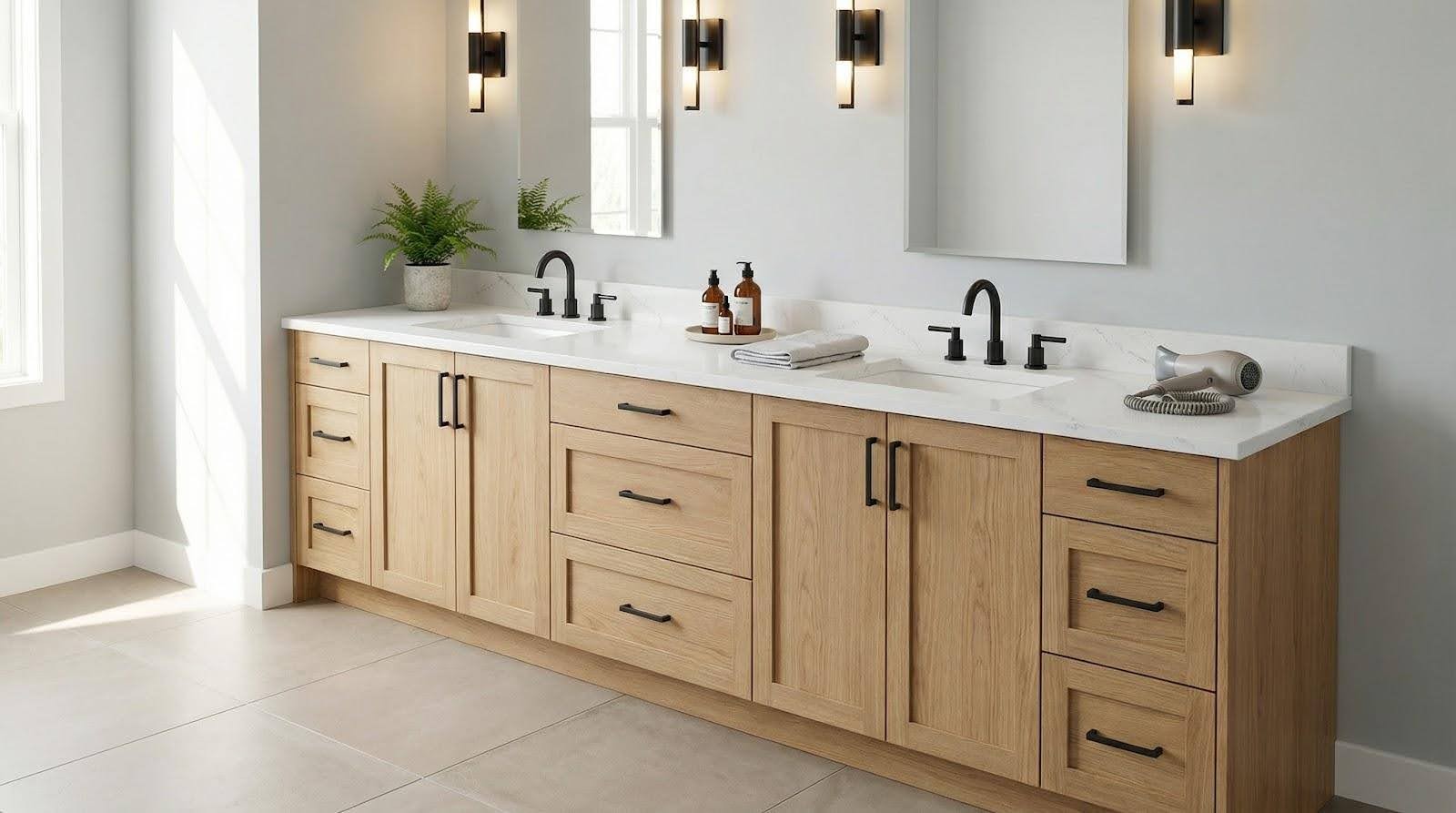 We recommend hardwood if long-term durability and spa-level style rank high on your list. For a quick, budget refresh in a home you plan to leave soon, a lighter engineered cabinet could make more sense.